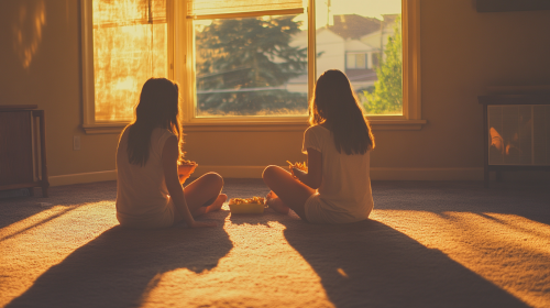two women sitting on the carpet with their backs against the wall in empty mid-west style lounge room, it looks like someone has just recently moved out. They eat in'n'out fries together. It looks like a photograph by Saul Leiter, strong lighting, vibrant colour, late afternoon light comes through the windows. --ar 16:9 --v 6.1