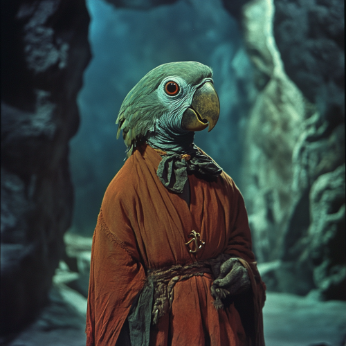 Low resolution screengrab of 1950's Super panavision 70 movie. Retro in colour. A humanoid figure with the head of a parrot. The setting is a dark fantasy world --ar 1:1