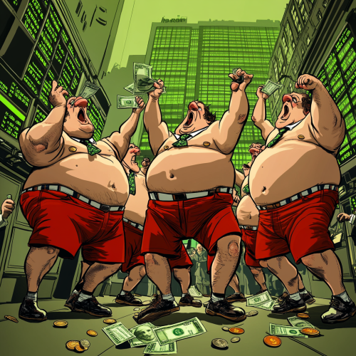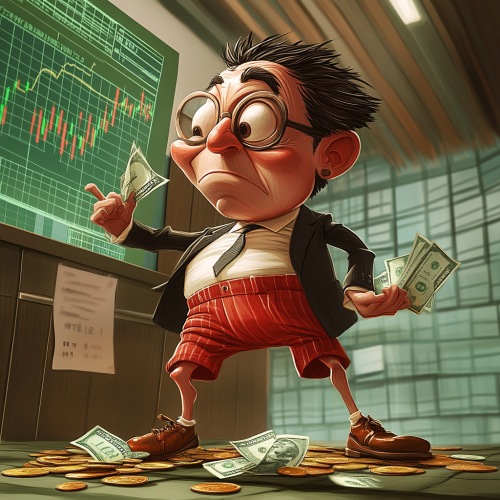 a cartoon caricature of an investment banker wearing tiny little red shorts over his business suit, make the shorts exremely small and squeezing him, while he scrounges to pick up coins and bills off the floor of the stock exchange, which the charts show green, upward trending stocks,