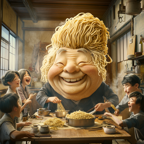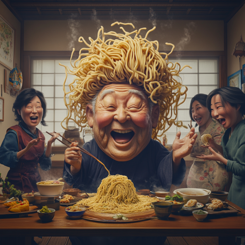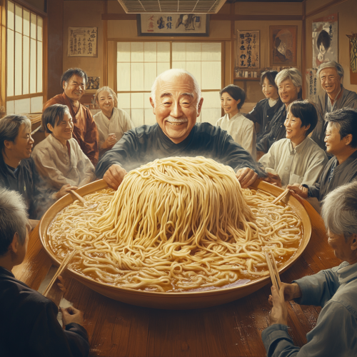 A scene depicting hyper realistic Japanese middle-aged men and women having fun, with a giant, hyper-realistic noodle-wearing Japanese grandfather sitting at the table. The grandfather has noodles for hair and a cheerful expression. Surrounding him are realistic Japanese men and women dressed in traditional kitchen attire, preparing and serving various noodle dishes. The atmosphere is lighthearted and humorous.