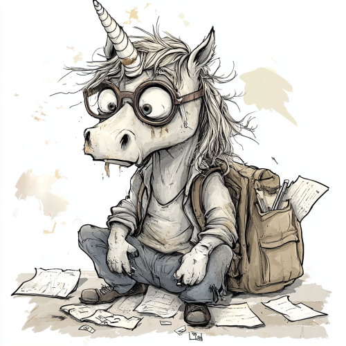 an unkempt unicorn, a cartoon of a unicorn who is wearing dirty clothes, has messy hair, looks tired, broken glasses, his backpack is half open and papers are spilling out