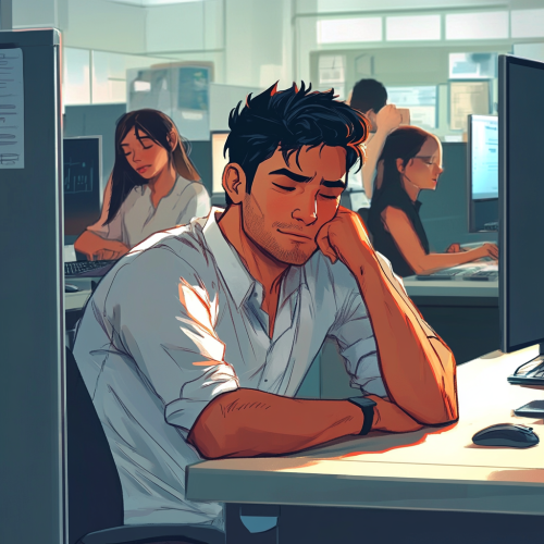 anime style illustration Latino man age 28, at work cubicle frustrated with his job, coworkers behind him, gossiping and laughing about him behind his back