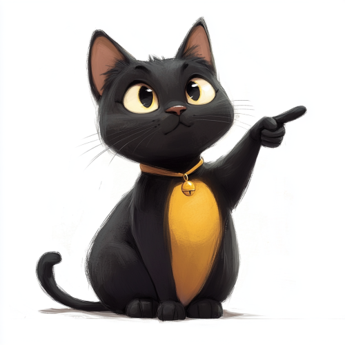 a cartoon of a black cat with a yellow chest, pointing with one hand, similing, seated, cartoon style, well detailed illustrated, white background, funny