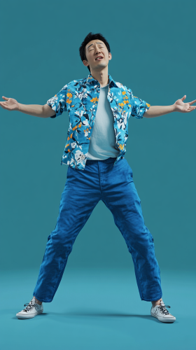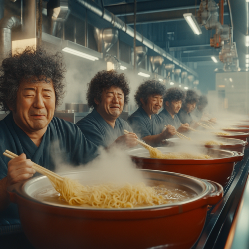 工場を舞台にした風変わりなシーン。リアルな日本の中年男性が、湯気の立つスープが入った特大のラーメン丼に楽しそうに座っています。男性はそれぞれ、ユニークな巻き毛のヘアスタイルで、麺を味わいながら大げさで陽気な表情を見せています。この設定は明るくモダンで、ラーメン丼が並ぶ工業用キッチンを彷彿とさせます。男性たちはカジュアルな服装で、遊び心とユーモアにあふれた雰囲気です。ラーメンを食べながら笑いと楽しみを共有する彼らの友情を強調し、この風変わりな環境でコミュニティ感覚を生み出します。