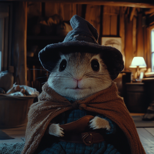 Low resolution screengrab of 1950's Super panavision 70 movie. Retro in colour. A humanoid figure with the head of a hamster. Wearing a wizards hat and a wizards cloak. The setting is a dark fantasy world. Cozy cabin interior. Warm lighting --ar 1:1