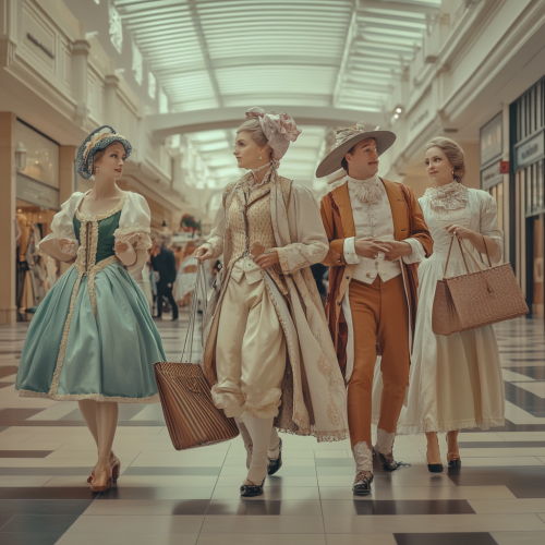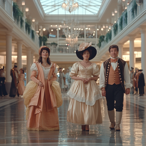 A scene with Jane Austen characters interacting as if Benny Hill scripted the scene, in a shopping mall, in the style of Super Panavision 70 from the 1950's