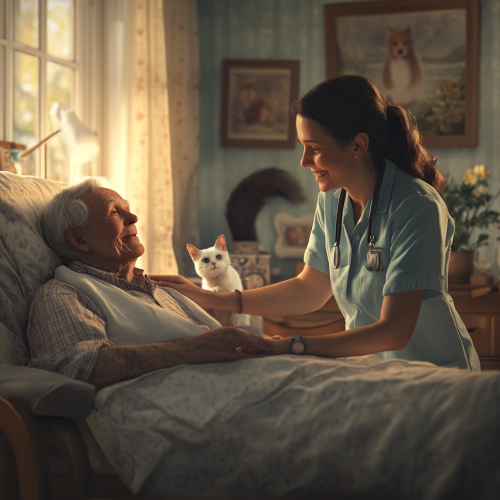 A friendly hospice aide interacting warmly with an elderly patient in a cozy home setting. The scene includes a touch of humor, like a playful cat in the background or a whimsical decoration. Hyperrealistic, natural lighting, candid expressions, DSLR photography, soft editing.