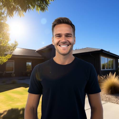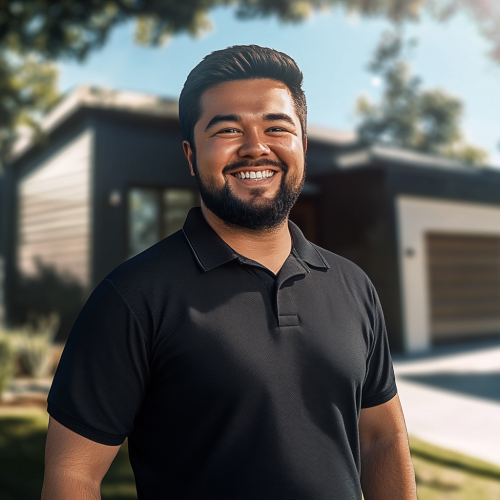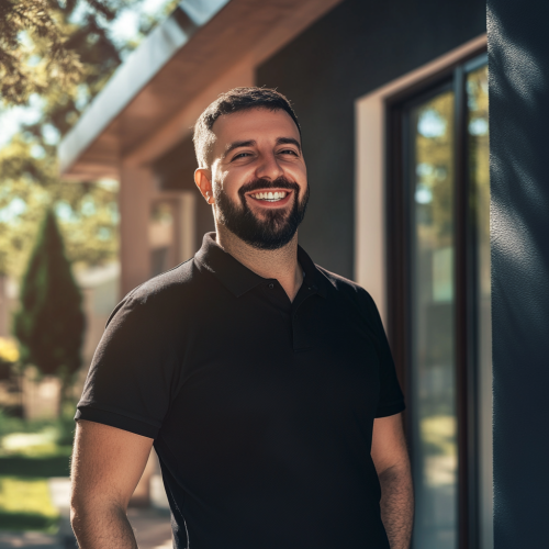 handsome heat pump engineer wearing black polo shirt is photoshopped to have a huge smile and puffy cheeks and big head. In the background you can see a beautiful, modern house. sunny weather, tree shadows, 8k, photography, authentic --v 6.1 --ar 1:1 --s 25