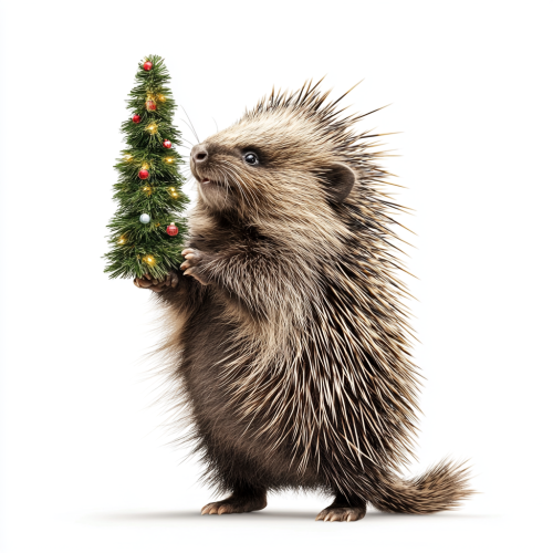 photo image of a north american porcupine, standing upright on hind legs, smiling, side profile view, long quills on the back decorated like a christmas tree, white background
