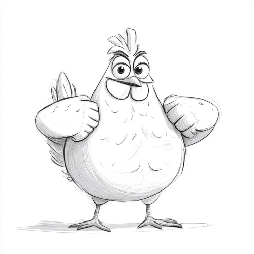 happy chicken with strong arms, lots of muscles, strong and big chest, white background. minimalist, flat, draw line black and white. old cartoon style.