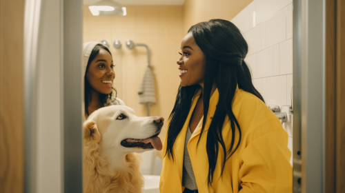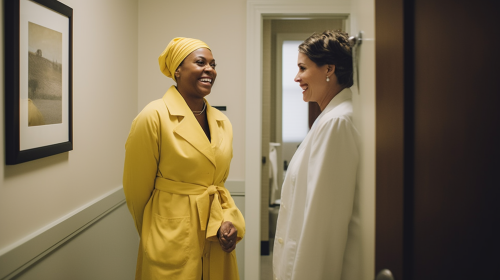 a wide shot photograph of a black woman in ger 40's. She is dressed in a white robe in an upscale bathroom. She is surprised to see a different woman who is actually a doctor dressed in a bright yellow lab coat, smiling, standing in her bathroom as well. The mood is funny and unexpected. they are both smiling. --ar 16:9 --v 5.0 --s 750