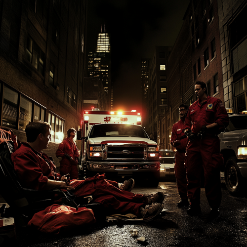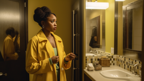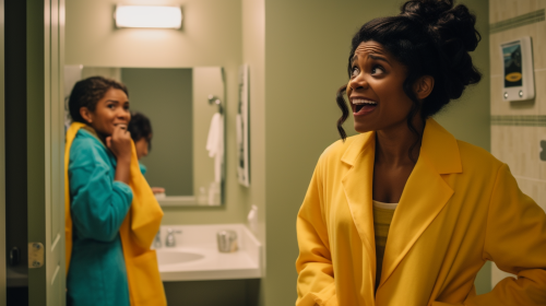 a wide shot photograph of a black woman in ger 40's. She is dressed in everyday clothes in an upscale bathroom. She is surprised to see a different woman who is actually a doctor dressed in a bright yellow lab coat standing in her bathroom as well. The mood is funny and unexpected. --ar 16:9 --v 5.0 --s 750