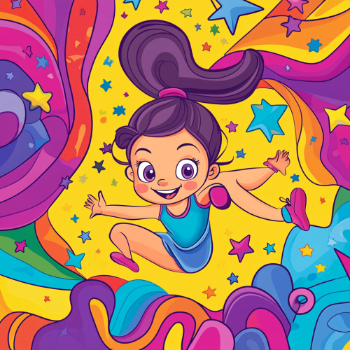 A vibrant and dynamic coloring book cover featuring a young girl, aged between 6 to 14, performing gymnastics in a cartoonish and funny style. The girl is smiling, striking an exaggerated, playful gymnastics pose like a handstand or balancing on a beam. The design feels lively and fun, with motion lines and exaggerated expressions to emphasize her athletic movement. ' is bold and playful at the top of the cover, surrounded by stars and whimsical shapes, giving it an exciting, humorous, and youthful appeal.