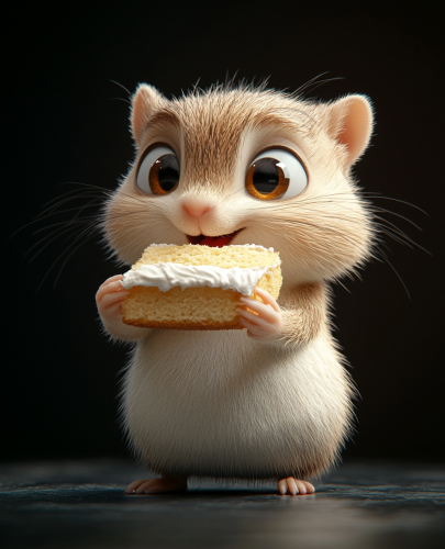black background. a humorous cute white chipmunk with bulging eyes pulls a piece of cake. Pixar engine, cartoon caricature design. --stylize 250 --v 6.1 --ar 179:220