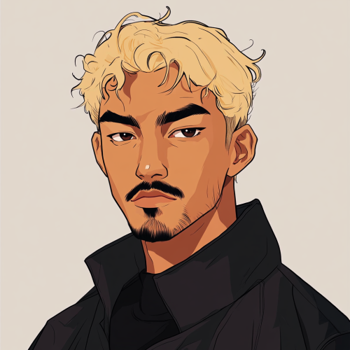 a vectorial person that has a blonde hair dyed with a moustache, chinese-like eyes but latino, and dressed with oversized clothes mostly black and with something that is related to a graphic designer