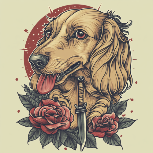illustration blonde miniature long haired dachshund done in american traditional tattoo style. Thick lines. The dachshund should be holding a dagger in it's mouth
