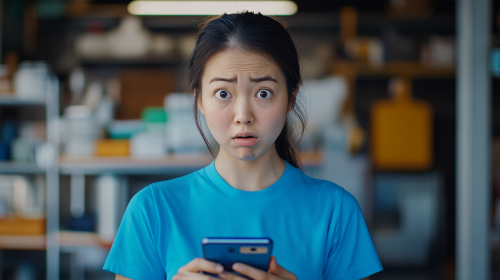 asian woman scrolling phone with funny face, she wears blue t-shirt, canteen background, front angle ,unreal expression, unreal gesture, super long shot, ultra realistic, --ar 16:9