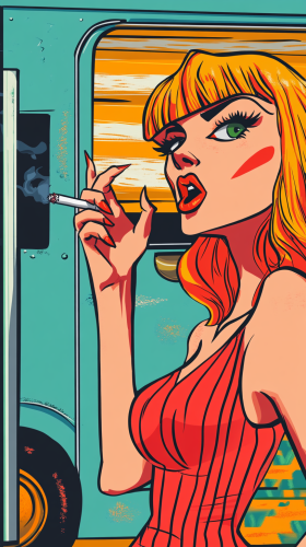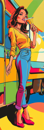 Cartoon illustration of a woman with a cigarette hanging out of her mouth, standing in front of a trailer and holding her hand up as if to stop someone. Pop art style with bright colors and crisp lines, humorous and exaggerated expression, with a playful, bold composition --ar 9:26 --seed 15