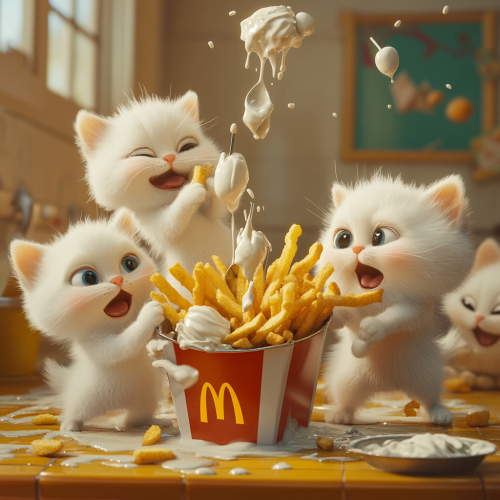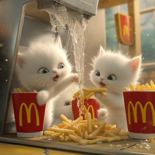 Disney Pixar cartoon style Adorable white fluffy kittens causing mischief dipping McDonald's French fries spilling out of an ice cream spicket machine that's spilling out everywhere at McDonald's.