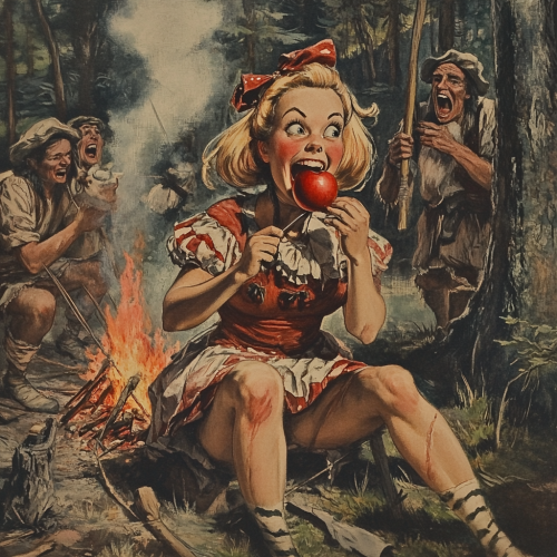 alice in wonderland being roasted on a spit over a fire, pilgrams and indians are surriounding her laughing, she has an apple in her mouth and a scared look on her face
