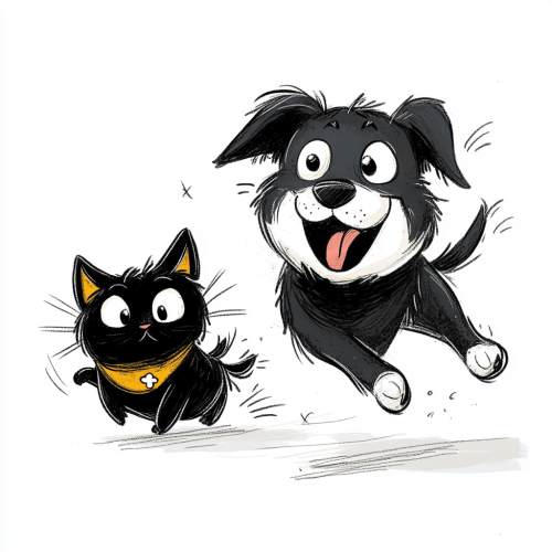A cartoon of black dog with white cheek and chest, running after a black cat with yellow chest, for illustration of story, funny, well detailed, white background