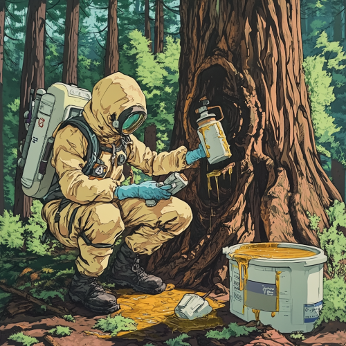 a chemist in biohazard gear pounding a maple tap into a huge redwood tree with sap oozing out of the tap. Theres a pile of white pvc pipes next to a tipped over box of butane canisters and an empty casserole dish on the ground. in the middle of a deep wooded forest - rick and morty art style