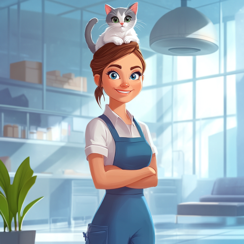 An attractive, cheerful woman cleaning inside a modern, well-lit building, with a playful cat sitting on her head. She is dressed in a professional cleaning uniform and has a warm smile, creating a friendly and inviting atmosphere. The background features a tidy, sleek interior, with the humorous detail of the cat adding a charming and lighthearted touch to the scene.