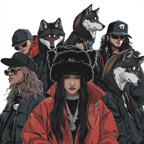 a cartoon illustration of several people wearing luxury streetwear and large black woolen hats with wolf faces, all characters facing the camera , white background, \clear lines, cel shading