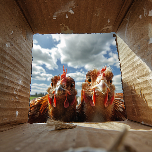 Create an image from the perspective inside a cardboard box, looking outward. The scene shows two curious chickens peering inside the box, as if surprised to see the viewer. The chickens’ faces are close, filling most of the opening, with a bright sky and fluffy clouds visible in the background. --v 6.0 --s 250 --style raw