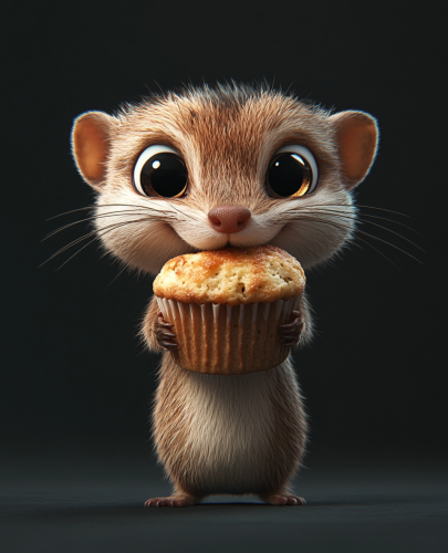 black background. a humorous cute weasel with bulging eyes pulls a muffin. Pixar engine, cartoon caricature design. --stylize 250 --v 6.1 --ar 179:220
