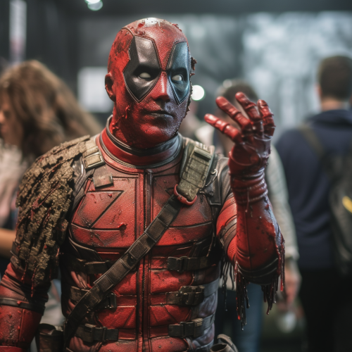 a highly realistic scene of a person dressed in a detailed Deadpool 2 movie cosplay outfit doing a funny pose. The setting is indoors, in a comic con atmosphere, with other people dressed as characters from different comic books and movies. The lighting is bright but natural, highlighting the intricate details of the costumes, especially the textures of the Deadpool suit. People are interacting in the background, some posing in costume for pictures, while others are walking by. There are people dressed as memebers of the comic characters surrounding deadpool. --v 5.0