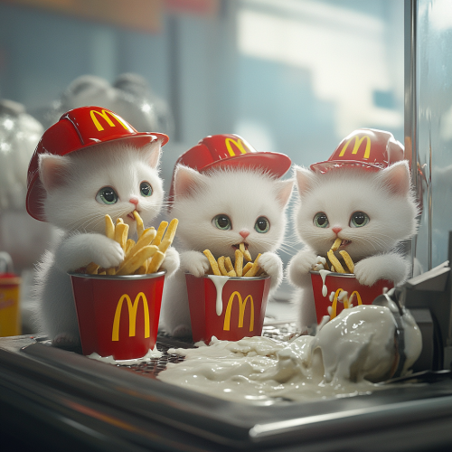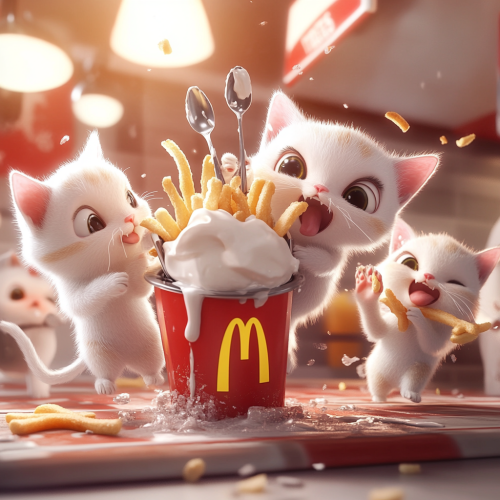 Disney Pixar style white fluffy kittens at mcdonalds dressed as workers with hats dipping fries into a broken commercial ice cream machine with spilled I've cream everywhere spoons in Mcdonalds