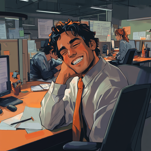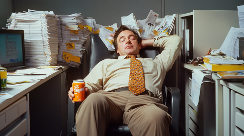a man in an office cubicle with mountains of work piled up behind him, bosses and people are shouting at him, he is blissfully unbothered laying back in his office chair with a tie around his head holding an orange soda can, relaxed, photorealistic, in the style of martin parr, --ar 16:9 --style raw