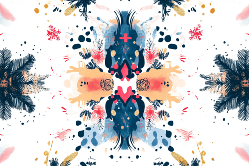 design a funny invitation card for a doctor's christmas party in the style of a rorschach test using typical christmas symbols, using just the colours capriblue gold magenta on a white background --ar 3:2