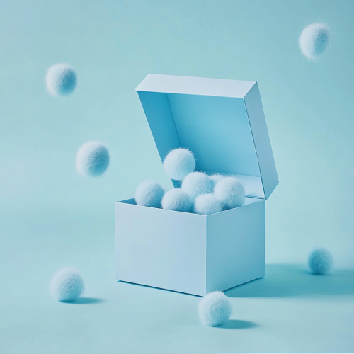 a photo of a simple all red gift box taken in an all red studio background. The lid of the gift box is open and there are 6 fuzzy tennis balls bouncing out of the box. The tennis balls have motion blur path behind them. There is ample space around the box in the center of the photo. The photo is taken from in front of the box. --v 6.1
