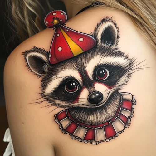 a traditional of a raccoon dressed as a circus clown. Full body image of the raccoon. The clown raccoon is on a girl’s left shoulder blade. Cute. Somewhat simple.