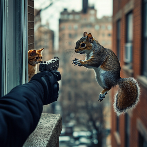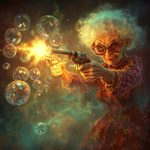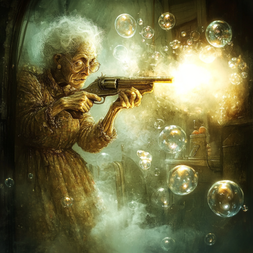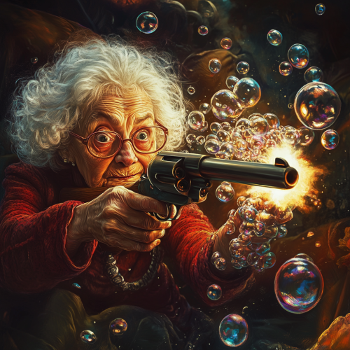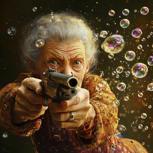 an old granny aims with a gun, many air bubbles come out of the barrel of the gun, funny environment, beautiful colors, many details, funny situation --p ie82c22 --v 6.1