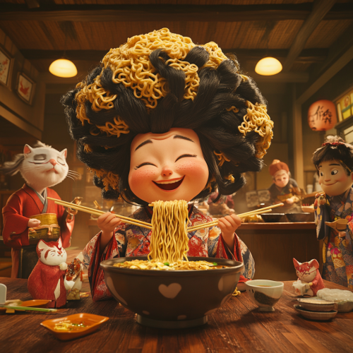 A humorous scene featuring a realistic Japanese middle-aged woman with an enormous hairstyle made of noodles, sitting in a traditional Japanese setting. She is holding chopsticks with a joyful expression while enjoying a large bowl of ramen. Around her are other realistic Japanese middle-aged individuals, actively preparing food and engaging with whimsical cats and other animated creatures in the background. The atmosphere is lively and playful, with warm lighting that highlights the colorful dishes and the cheerful interactions among the characters. The decor includes traditional Japanese elements, enhancing the cultural ambiance.