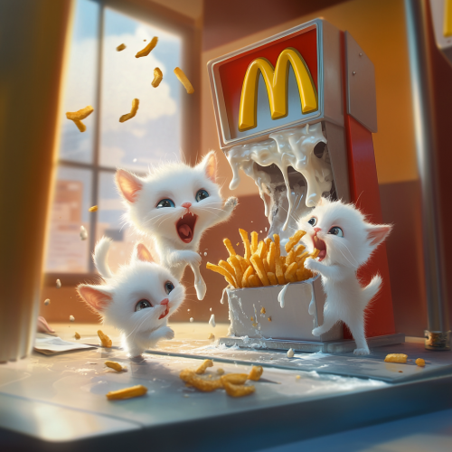 Pixar cartoon style Adorable white fluffy kittens causing mischief dipping McDonald's French fries in a broken ice cream machine that's spilling out at McDonald's. Old ice cream machine in background