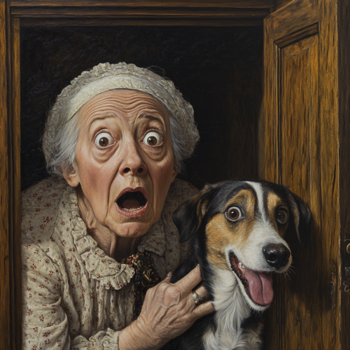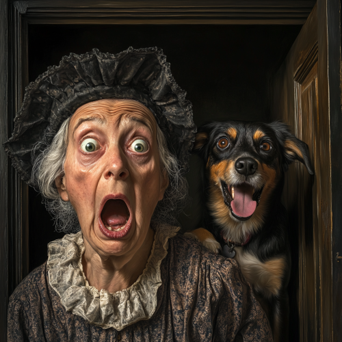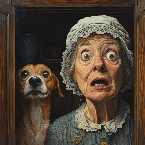 old mother hubbard and her dog in front of an empty cupboard, looking shocked scared afraid, in the style of hyperrealist, iconic pop culture caricatures, victorian genre paintings, highly staged scenes, humorous tableau