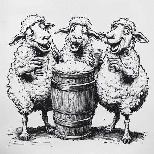A detailed, black-and-white pen and ink illustration of three sheep standing around a keg at a party, each holding a plastic cup. The scene is in the style of Frank Frazetta. Two sheep appear visibly drunk with goofy, carefree expressions, while the third sheep has a mischievous look, hinting at trouble. The background is simple, keeping the focus on the sheep and the keg.