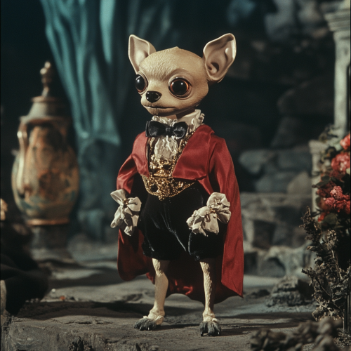 Low resolution screengrab of 1950's Super panavision 70 movie. Retro in colour. A humanoid figure with the head of a chihuahua dog dressed as a duke. The setting is a dark fantasy world --ar 1:1