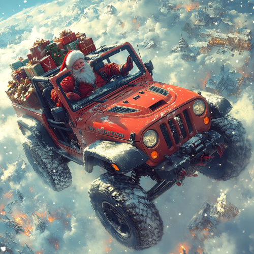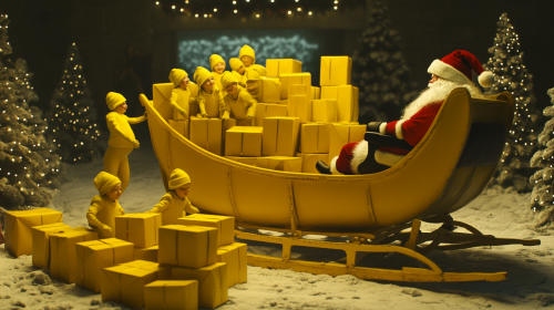 A hyperealistic Christmas scene with Santa Claus dressed in yellow sitting on a yellow sleigh on the right side. In the center of the image, the back of the sleigh is visible, filled with various-sized packages and boxes neatly stacked. Towards the back, several small elves dressed in yellow are cheerfully helping load more small boxes onto the sleigh. The setting should be playful and full of Christmas spirit, with the color scheme focused on yellow for the sleigh, Santa, and the elves. The background should be simple (night scene) to keep the focus on the characters and the sleigh. --ar 16:9