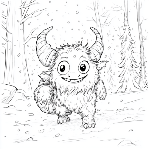 Coloring page illustration of Adorable Krampus – Krampus is a round, cute figure with thick, bold lines, stomping through a snowy forest with large, round eyes and a grin. He drags his sack behind him, leaving simple, bold-lined footprints in the snow. In the background, simple, bold-outlined trees stand in a row, with minimal snowflakes falling in clean, bold shapes.