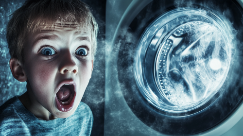 close up of boy's face going mad watching a washing machine spinning, the washing magine can be seen in full and it's trembling like crazy, the kid's eyes are all looking in weird directions --ar 16:9