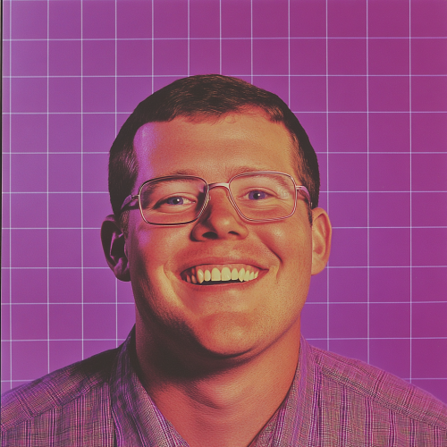 A photo of a laughing face from a 1990s tech magazine, with glasses and short hair, against a purple grid background. The man is smiling widely at the camera, showing his teeth. He has a round head shape, a slightly overweight body type, a medium skin tone, and blue eyes.