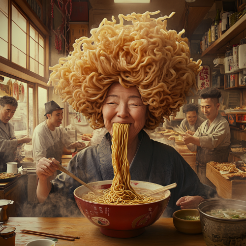 A humorous scene depicts a hyper realistic middle-aged Japanese woman with a super-sized noodle hairstyle. She is sitting in a realistic Japanese background of a ramen shop, enjoying a large bowl of ramen with a joyful expression. Surrounding her are other realistic middle-aged Japanese men and women, actively preparing ingredients. The decoration includes Japanese elements, complementing the cultural atmosphere.