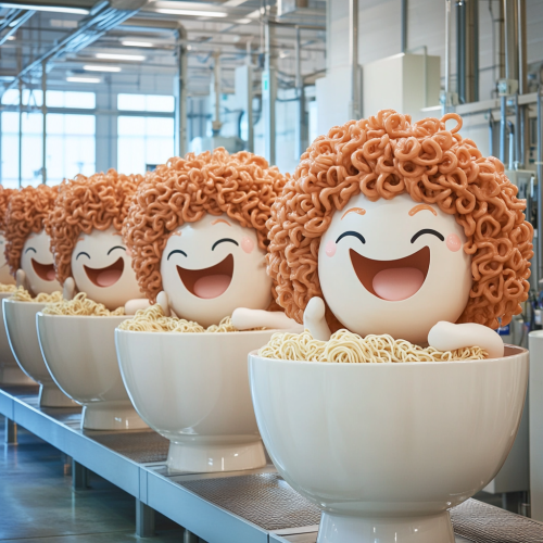 A whimsical and surreal factory setting filled with oversized ramen bowls, each with a curly-haired character peeking out, laughing joyfully. The characters should have exaggerated facial expressions, as if they're enjoying their ramen experience. The factory has a bright, clean aesthetic with a modern office design in the background. The colors should be vibrant and eye-catching, creating a playful and humorous atmosphere. Emphasize the quirky and slightly bizarre elements of this ramen-themed scene.