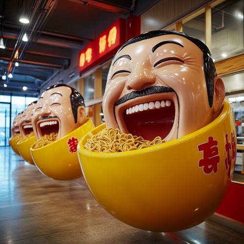 A whimsical and surreal factory setting. Oversized ramen bowls are lined up, with a realistic looking middle-aged Japanese man peeking out of each bowl and laughing with glee. The man has an exaggerated expression on his face as if he is enjoying his ramen. The factory has a bright and clean atmosphere, with a modern office design in the background. The colors are vibrant and eye-catching, creating a playful and humorous atmosphere. It accentuates the quirky and slightly strange element of this ramen-themed scene.