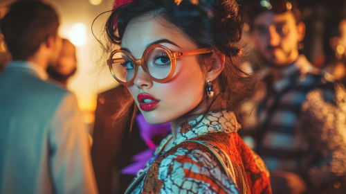 An image of a woman with a playful, slightly clueless expression, wearing exaggerated fashion accessories, like oversized glasses or a quirky outfit. She is standing in a stylish setting, surrounded by men who are either amused or intrigued by her. The background is blurred, focusing on her, with an air of light-heartedness and humor, suggesting the theme of men being drawn to her despite her ditzy persona. High resolution, 1920x1080 pixels, --ar 16:9